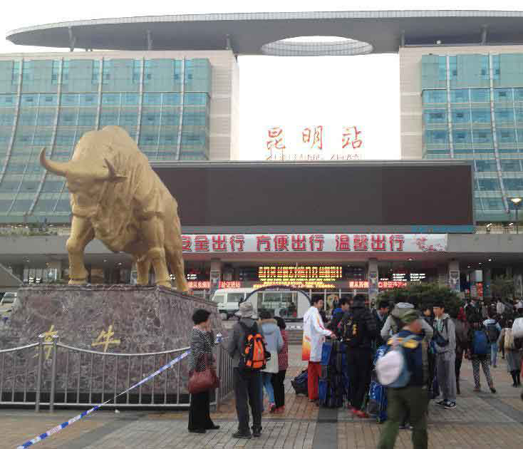 3月2日清晨,乘客在昆明火車站的站前廣場上